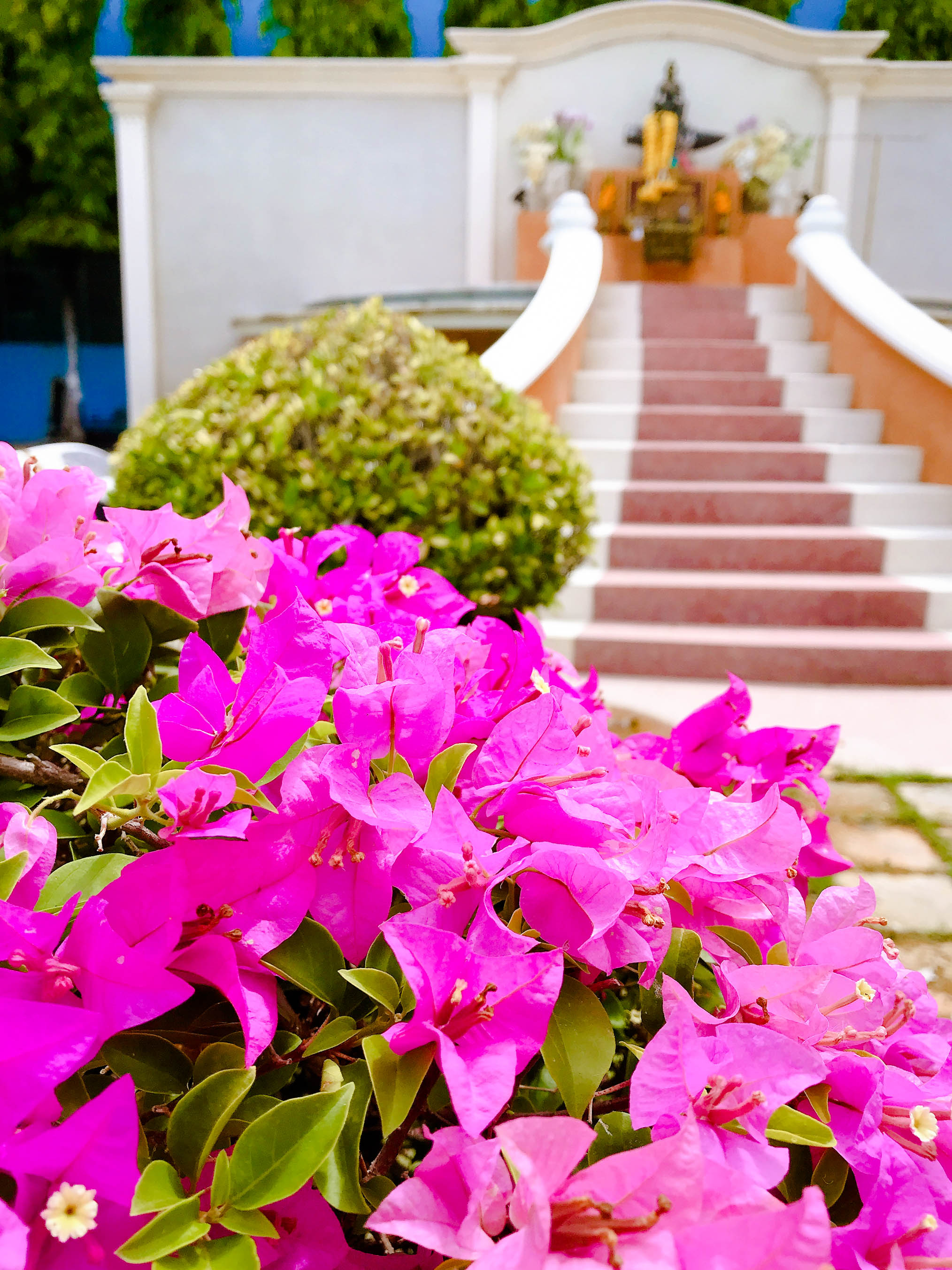 ต้นเฟื่องฟ้า เป็นไม้ยืนต้นประเภทพุ่มกึ่งเลื้อยอายุยืนหลายสิบปี มีดอก(ใบประดับ)หลากสีสัน เช่น ม่วง แดง ชมพู ส้ม ฟ้า เหลือง เป็นต้นไม้ที่ชอบแสงแดดจัดและทนทาน